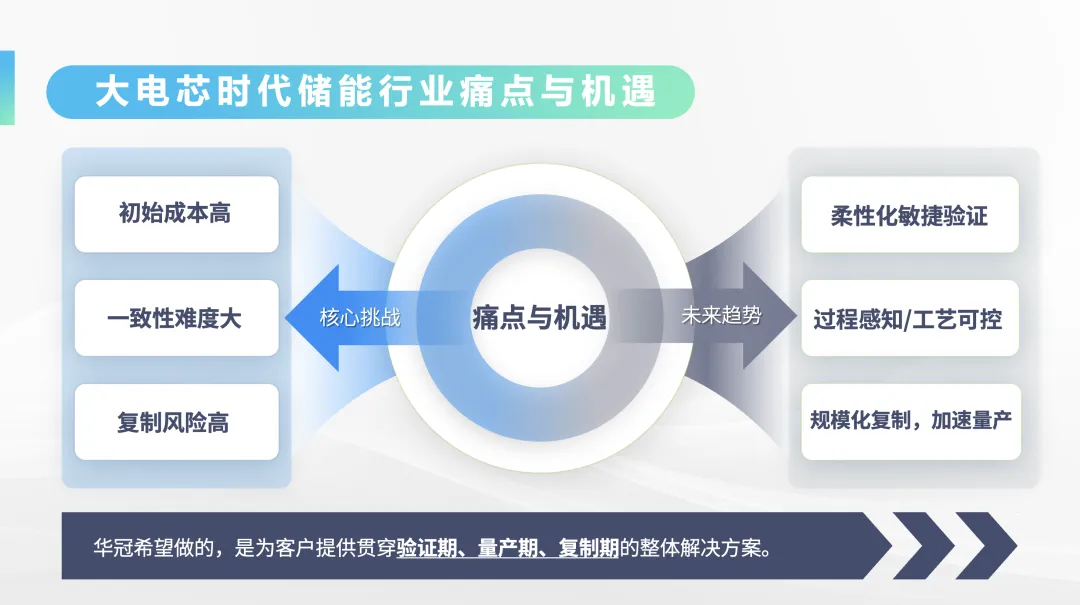 针对储能客户普遍面临的“投入高、试错多”“一致性难控”“扩产难复制”等痛点,华冠科技提出了以“验证期–量产期–复制期”为主线的全周期解决方案,贯穿产品开发、投产与量产扩建全过程。