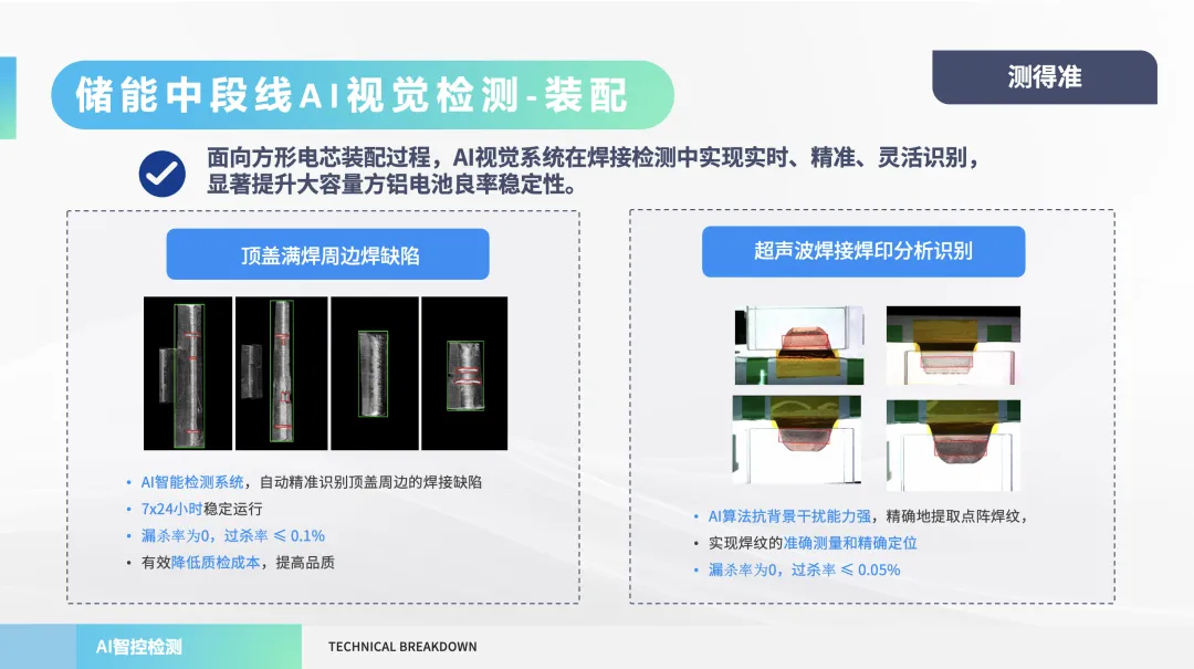 在中段装配线中,采用立式结构设计,搭配磁悬浮输送和大理石高精度工位,实现运行稳定性与节拍效率的双提升;在激光焊接环节,引入环形光斑与准连续激光器,在实现熔深一致性的同时,适配大容量储能电芯对焊接可靠性的更高要求;在检测环节,华冠科技配备间接检测(WDD)与直接检测(LDD)双重焊接检测系统及AI视觉系统,在压花检测、焊接缺陷识别、装配精度确认等关键环节构建出高精度、0漏检率的检测能力;在溯源环节,华冠科技通过MES系统搭建覆盖全流程、可回溯、可量化的数字化档案体系,为客户提供标准化、透明化的质量控制支撑。
